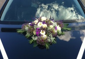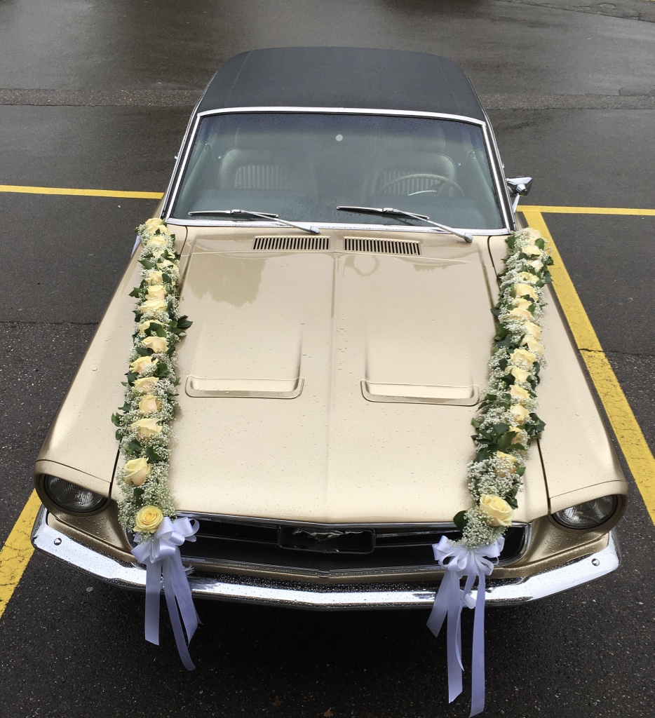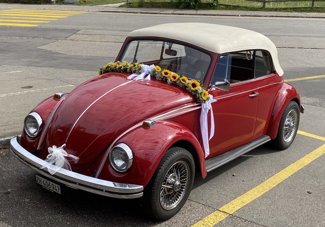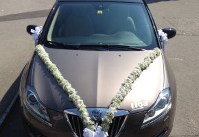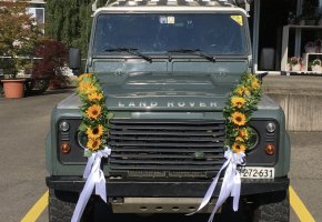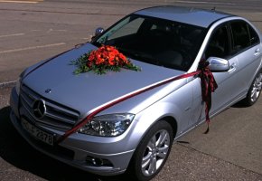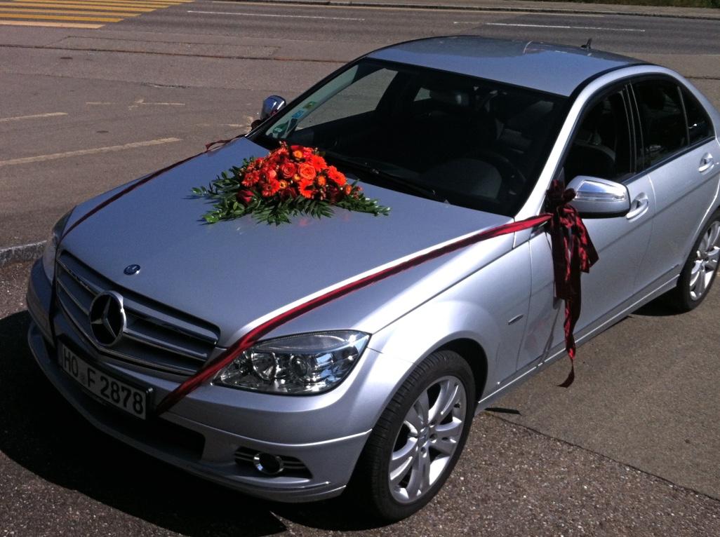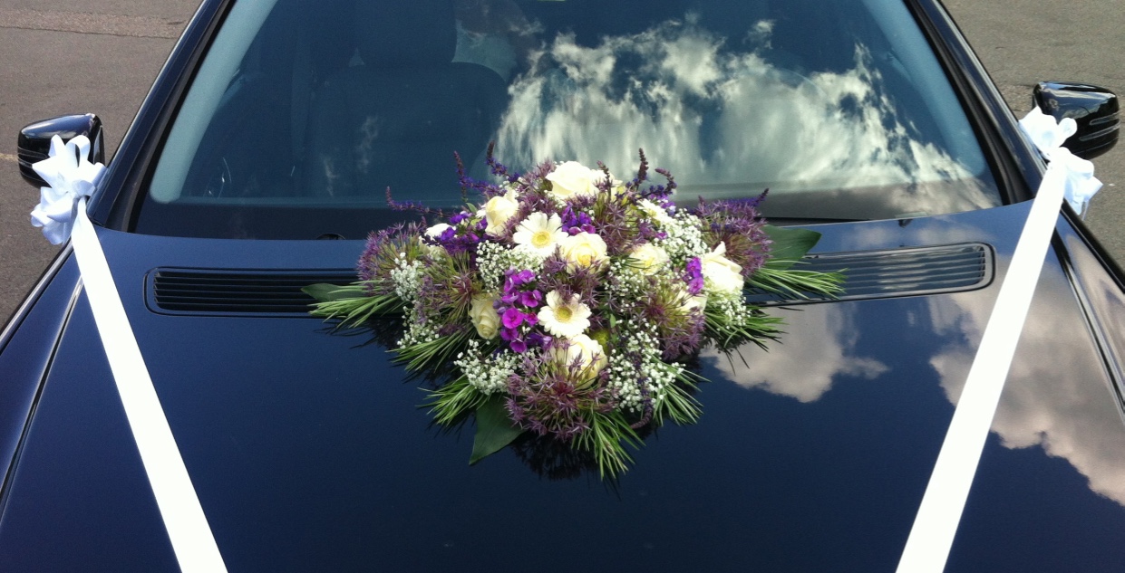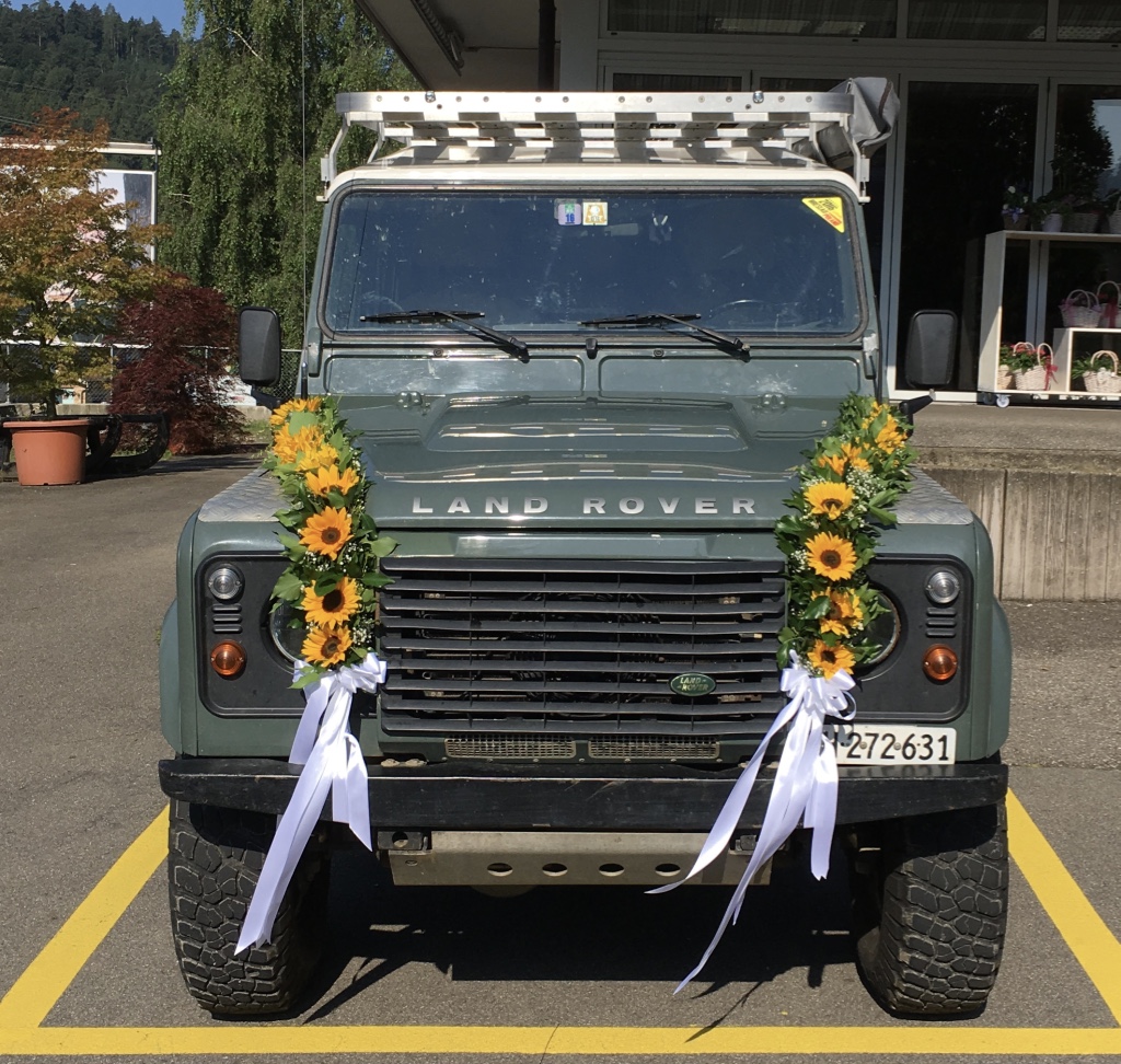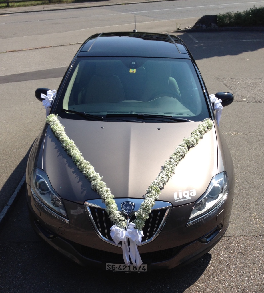 Das blumig dekorierte Auto zeigt den glücklichen Anlass.