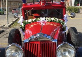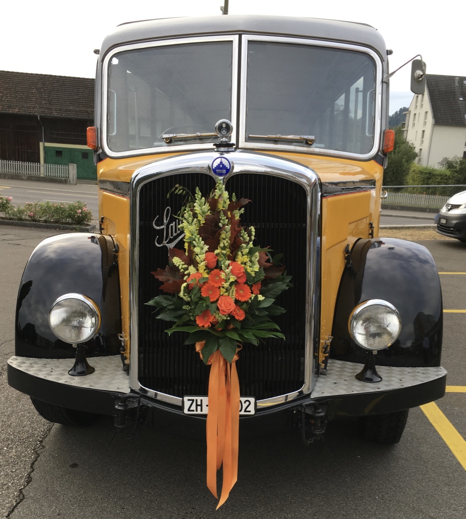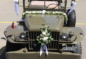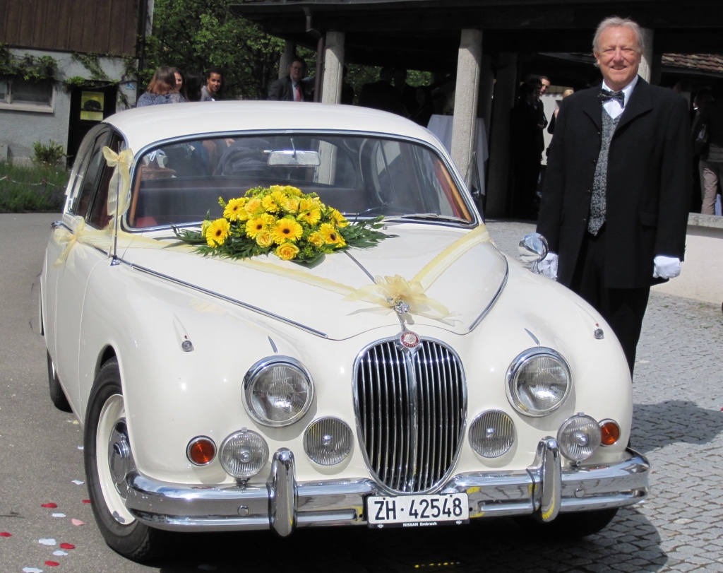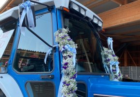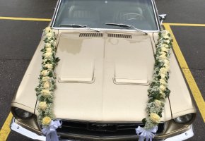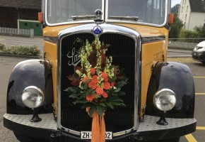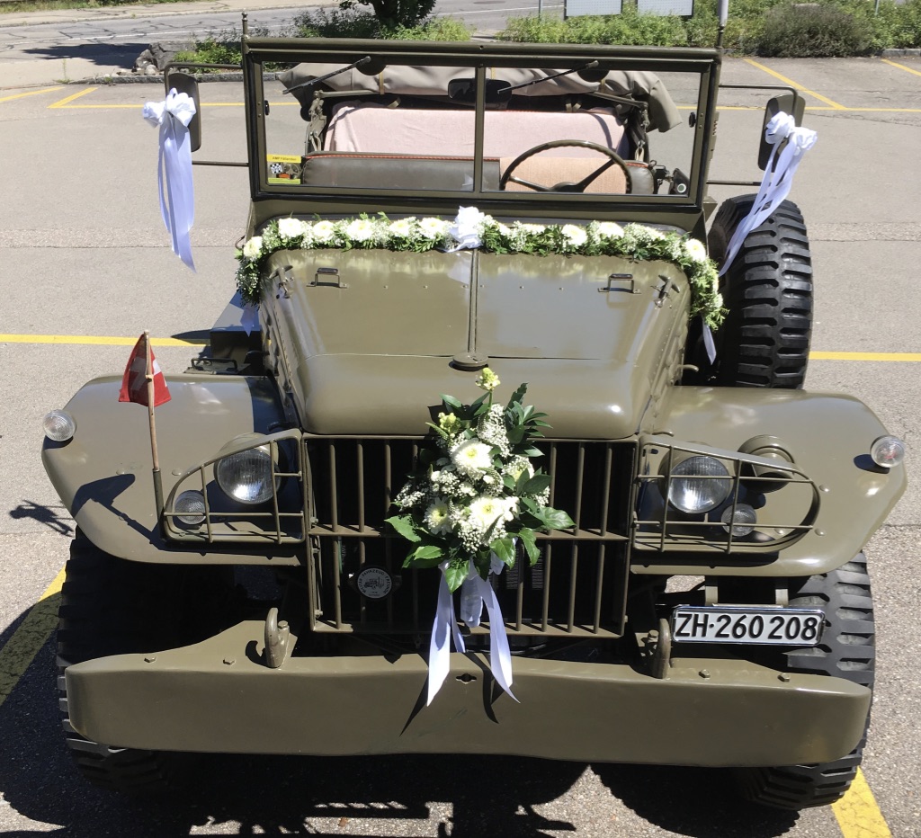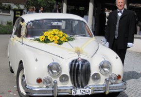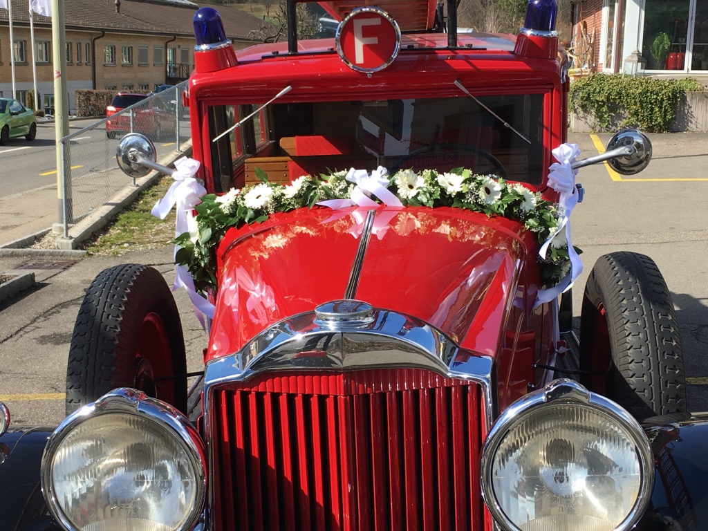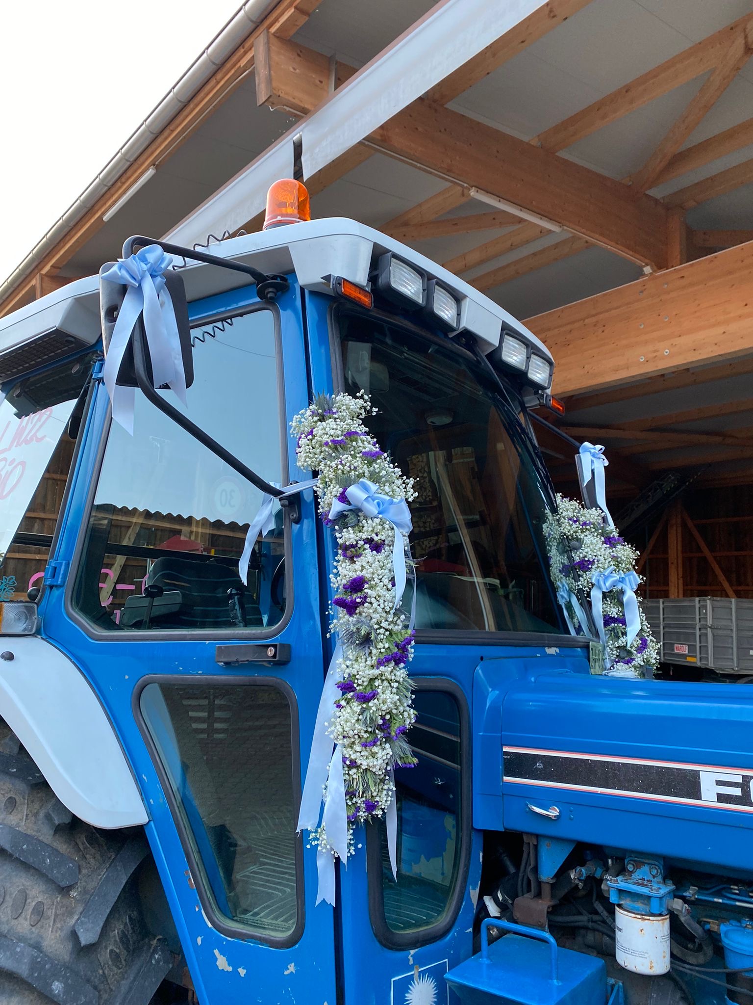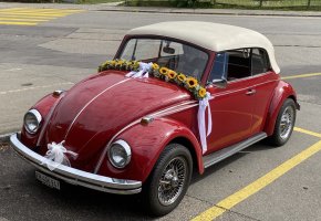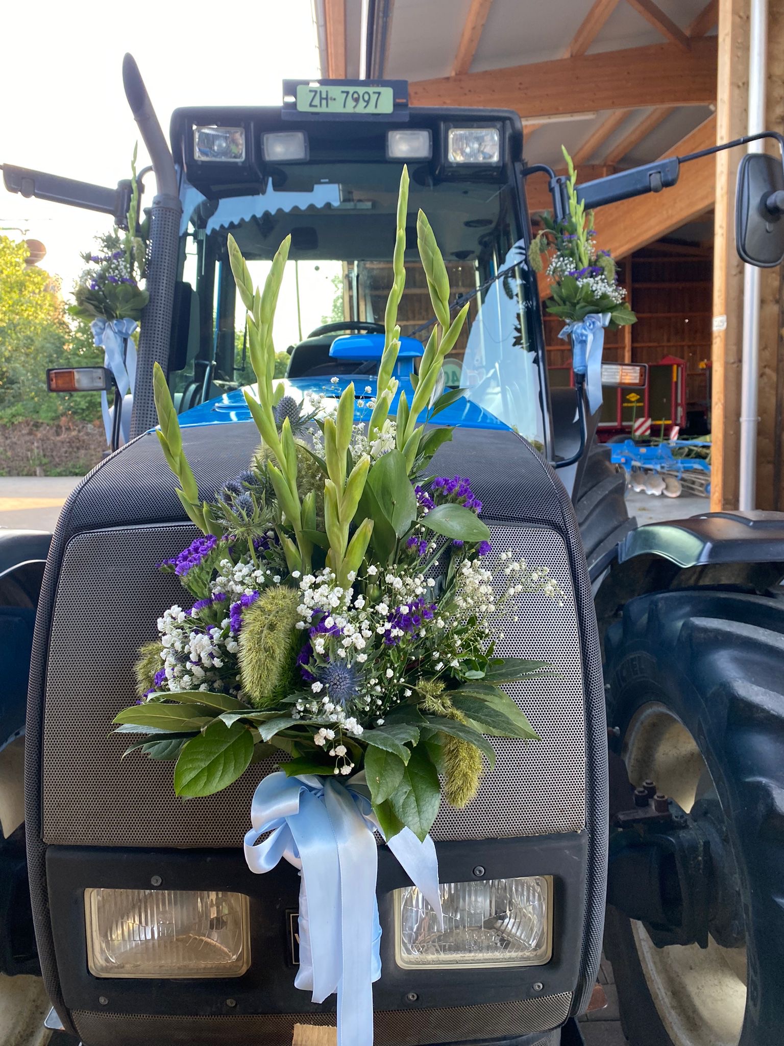 Das blumig dekorierte Auto zeigt den glücklichen Anlass.